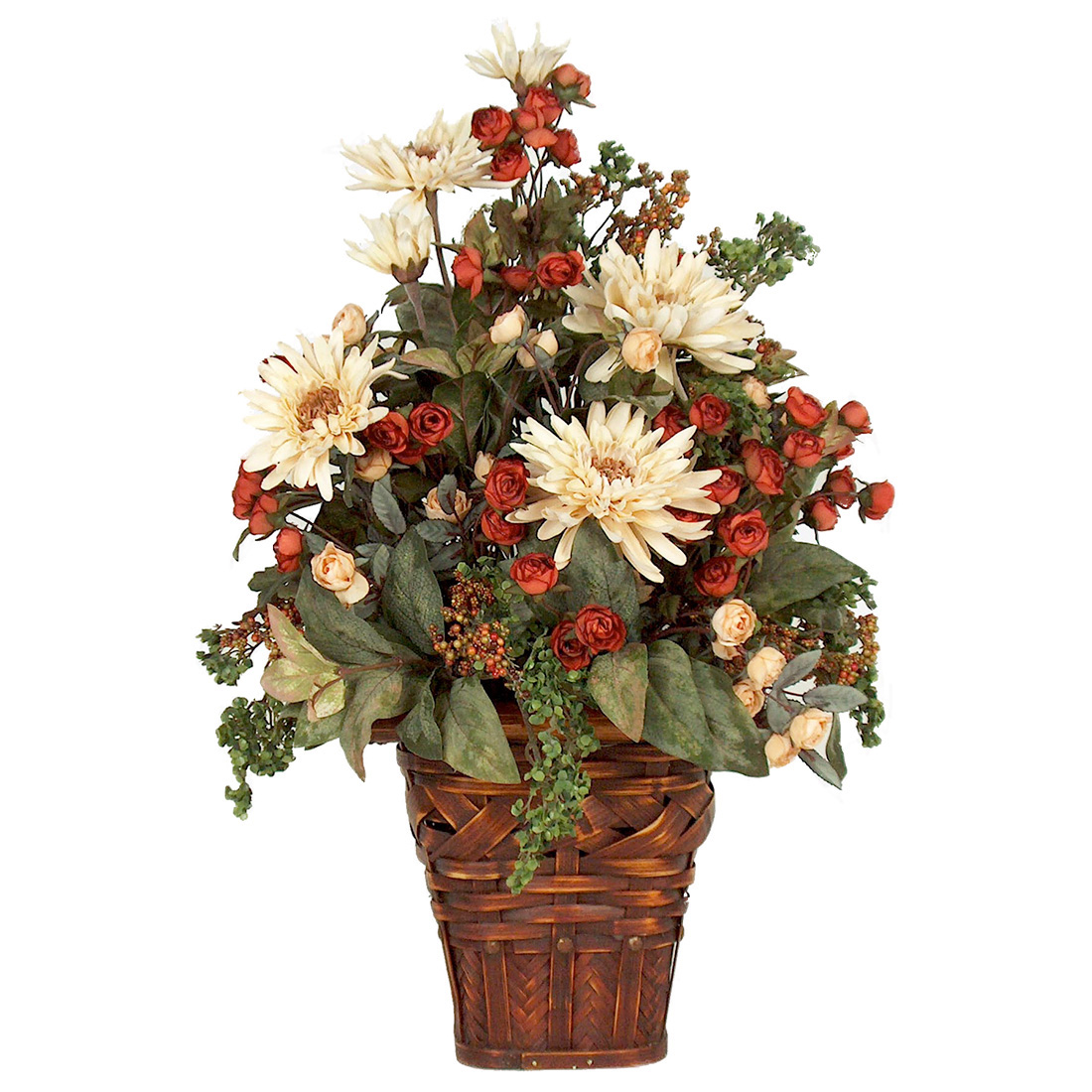 Decorate a sitting room or screened in porch with this cheerful arrangement. Crafted using cream mums, rustic mini roses and berries in woven basket this arrangement will look fabulous as part of your decor year round.
