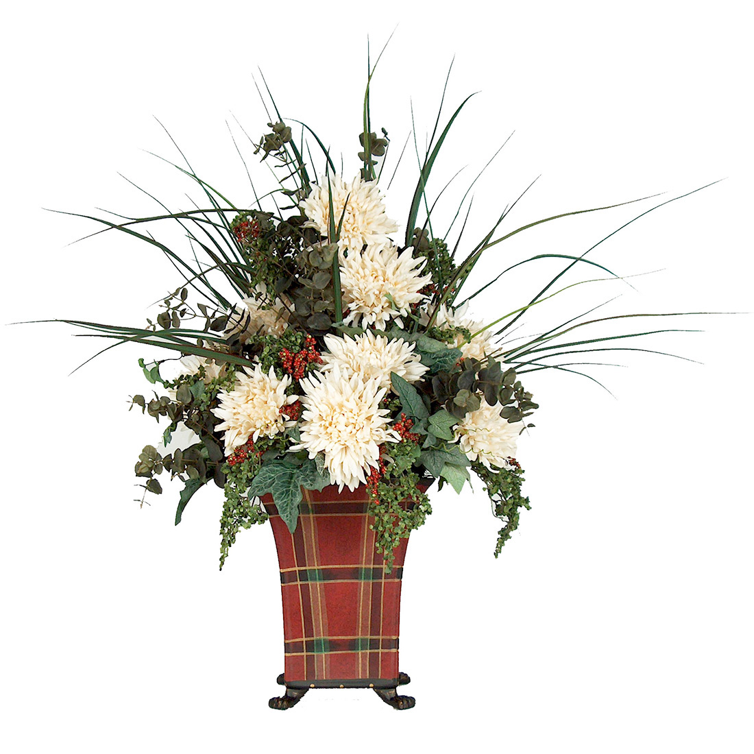 Evoking feelings of the Munros in Scotland this playful centerpiece arrangement will look beautiful in a traditional home. The arrangement is crafted using cream mums, berries and frosted ivy in a porcelain plaid vase.