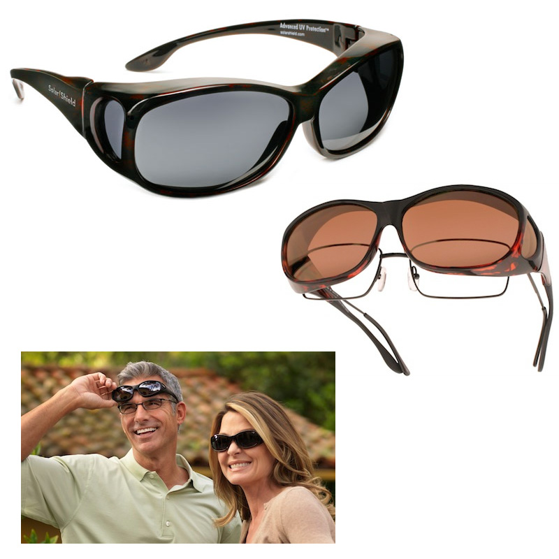 Fit-Over Polarized Sunglasses are a practical, fashionable and affordable alternative to prescription sunglasses. They are specifically designed to fit over your prescription glasses but may be worn alone. Fit-Over Sunglasses are available in a variety of shapes and sizes. 100% protection from dangerous UVA/UVB rays.