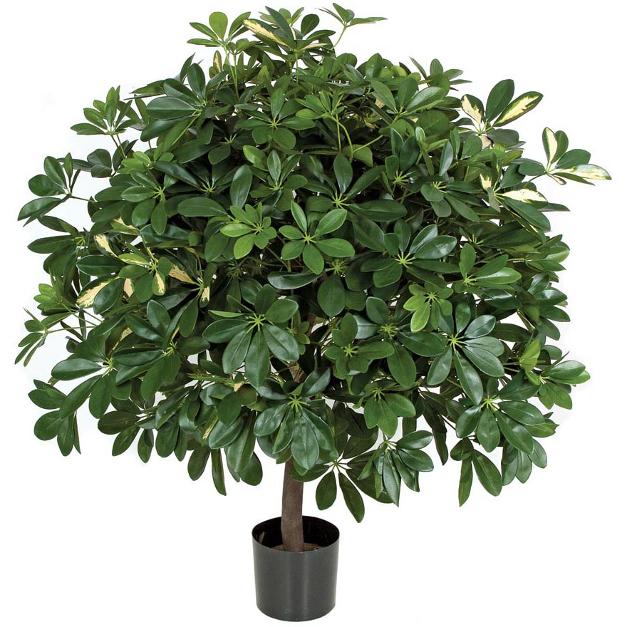 The full, green 43 inch Schefflera Ball Tree delivers freshness and color into any space. This tree has fire retardant foliage and boasts a natural trunk that will keep your guests guessing.