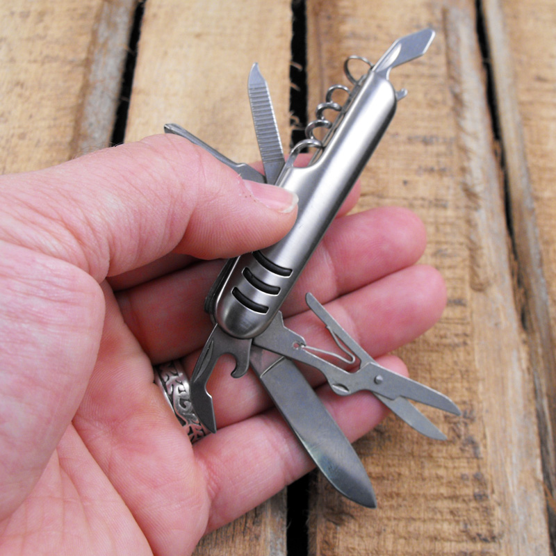 This tough little pocket knife is small enough to fit on your key ring or in your pocket but still take care of the little day to day jobs. It's made of stainless steel, includes a key ring loop and has a knife, scissors, can opener, cork screw, bottle opener, nail file and phillips screwdriver.