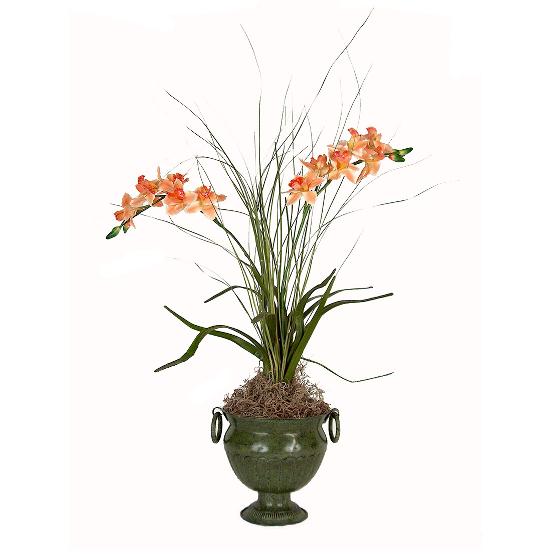 This tall orchid arrangement will capture your guests eyes when placed on the welcome table in your foyer. We have crafted this centerpiece arrangement using peach cymbidium orchids and natural spiral grass and placed them in a metal pedestal bowl. The orchids are so life like your guests will have to touch them to know they are artificial.
